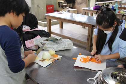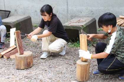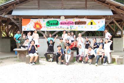 キャンプ場に入り、スローガンを掲げ、その前で集合写真を撮りました。