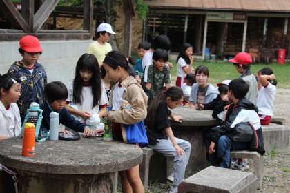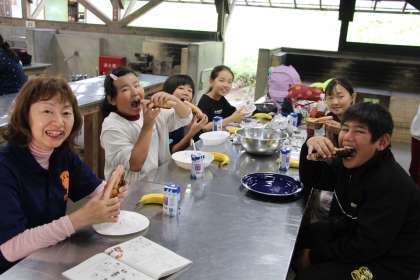 2日目がスタートしました。朝のくつろぎ、朝の集い、朝食のカートンドッグを食べている様子です。