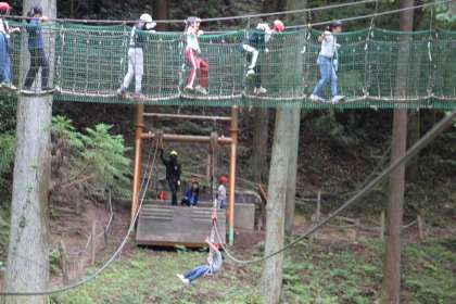 午前中は、アスレチックを楽しみました。まず、森の迷路からスタートし、様々なアトラクションに挑戦しました。