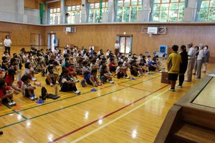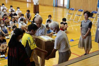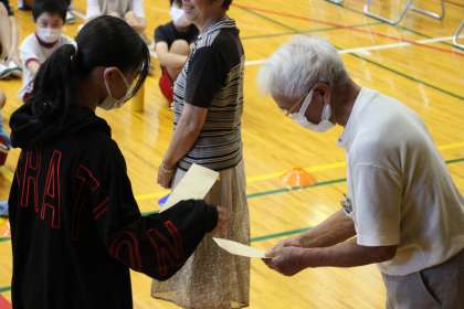 朝一番の全校集会は校長の話と地元老人会の方からの「ぞうきん贈呈式」でした。老人会の方から受け取ったぞうきんは、子どもたちが大切に使わせていただきます。お礼に、子どもたちから「缶バッチ」をプレゼントしました。