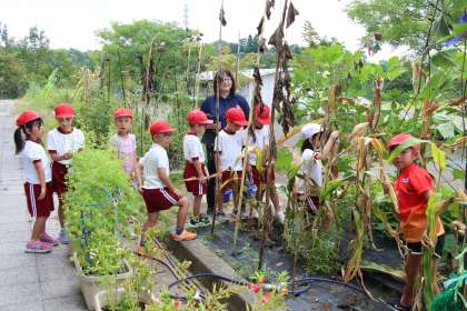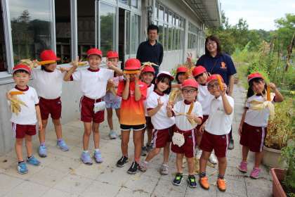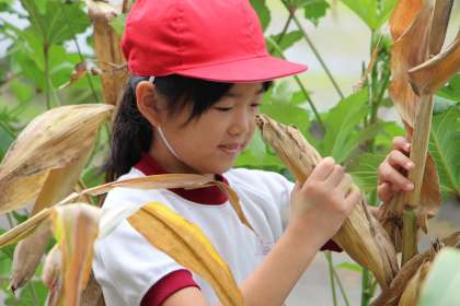 1年生の生活科「トウモロコシ収穫」の様子をお知らせします。学級園に植えた「ポップコーン用のトウモロコシ」の収穫を行いました。一人ずつ収穫して、皮をむき、全員で記念撮影を行いました。