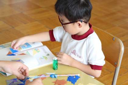 算数は、三角形を組み合わせてできる形づくりをしました。組み合わせ方によって、様々な形に変身することろがポイントでした。