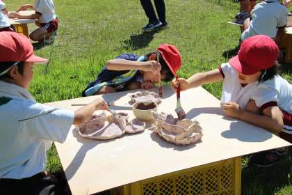 2年生の陶芸「釉薬塗り」の様子をお知らせします。陶芸作品に色艶を出すために釉薬を塗ります。全体的にまんべんなく塗るとともに、細かいところも塗りのこしがないように慎重に活動することができました。