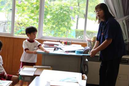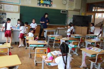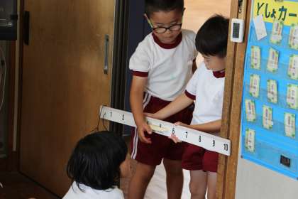 1年生算数 公開日 2023/09/15 更新日 2023/09/15 お知らせ 1年生の算数「ながさくらべ」の授業の様子をお知らせします。本時は「教室の間口から教師用机は入るだろうか」という課題で行いました。 定規で測れば簡単ですが、定規がなかったらどうするかを、いろいろな方法で試しました。セロテープやタフロープ、ホワイトボードをつなげるなど試行錯誤して、実際に試しました。