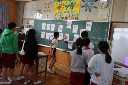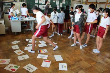 6年生の外国語「単語の復習」の授業の様子をお知らせします。これまで習った多くの単語のピクチャーカードを並べ、かるたの要領で発音された単語のカードを取るゲームでした。