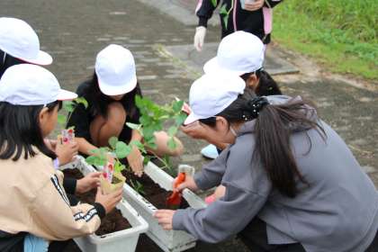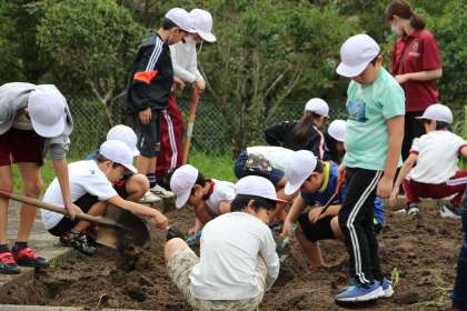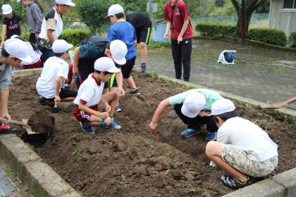 4年生の総合「冬野菜の植え付け」の様子をお知らせします。地域ボランティアさんが肥料をまき、寝かしておいてくれた畑の掘り起こしと畝づくり、冬野菜やいちごの苗の植え付けの準備を行いました。