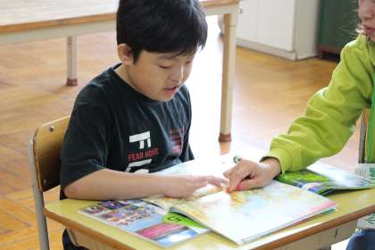あすなろ学級の授業 公開日 2023/10/05 更新日 2023/10/05 お知らせ あすなろ学級の道徳と社会の授業の様子をお知らせします。社会では地図帳を使って山や川などの地名を確認していました。写真は「浅間山」の位置を確認している場面です。