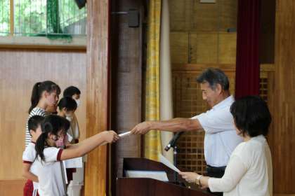 表彰の時間は、学級委員、各委員長の任命と、夏休みの詩、作文、感想文で優秀な成果を上げた児童の表彰伝達を行いました。