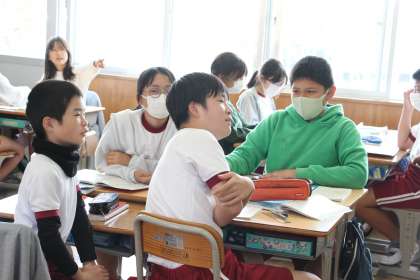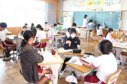 6年生の国語「海のいのち」の授業の様子をお知らせします。この物語の題名に込められた意味を班で話し合い、班の考えを板書している場面です。一人で考えるのは難しいけれど、自分の考えを出さずにお客様になってもいけないので、班単位で意見を出し合う場を設け、学級全体で共有しながら学びを深めました。