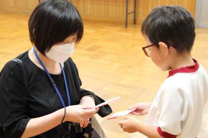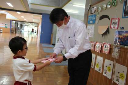あすくす学級缶バッチ贈呈 公開日 2023/10/18 更新日 2023/10/18 お知らせ 本日、教育長が来校されたときに、あすくす学級で作成している缶バッチをプレゼントしました。今年のバージョンはこれから作成しますが、昨年度の150周年記念バッチとオリジナルだたみんのバッチを、来校された方全員に手渡しました。
