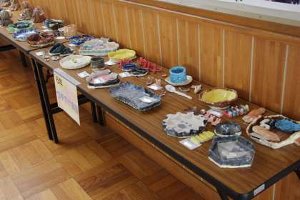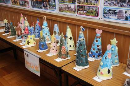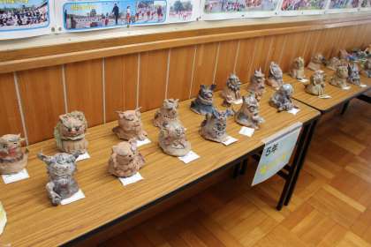 4〜6年生の陶芸作品展示です。4年生「やさしい灯」、5年生「楽シーサー」、6年生「ブチアゲ食器」がテーマです。今後、石畳朝市等の展示も視野に入れていますが、しばらくは職員室前廊下に展示してあります。地域にお住まいの方も、興味がおありの方は、ぜひご覧ください。
