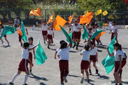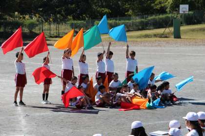 5・6年生の「フラッグ」の演技の様子を、5年生を中心に紹介します。まずは、学年ごとに円陣を作り、気合を入れてから演技が始まりました。