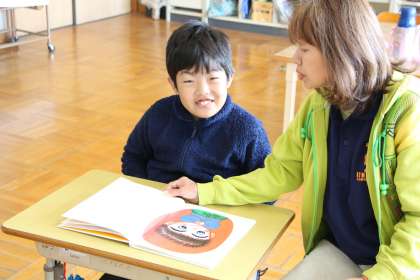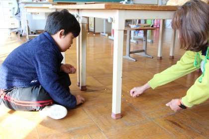 あすなろ学級の読み聞かせと生活単元の授業の様子をお知らせします。生活単元では、トウモロコシの計量の際、袋の口が緩んで床に散乱してしまいました。散乱したトウモロコシを担任とともに、片づけている場面です。これも立派な学習の場面です。