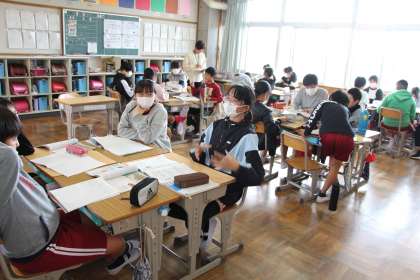 6年生の授業 公開日 2023/11/06 更新日 2023/11/06 お知らせ 6年生の社会と外国語の授業の様子をお知らせします。社会は「戦国の世から天下統一へ」のまとめを行いました。 外国語は「ALTに自分の動物を紹介する練習」を行いました。私がのぞいた時は、「カエルの鳴き声の表現が日本語と英語では違うのだよと」いう話題で、子どもたちも興味深げでした。