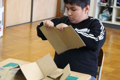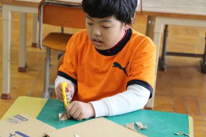 図工は、段ボールを使っての創作活動です。段ボールを適当な大きさに切った後、切り込みを入れて組み合わせ、立体物を作りました。