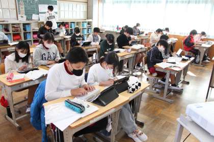 6年生の社会と国語の授業の様子をお知らせします。国語は「世界に目を向けて意見文を書こう」の単元ですが、タブレットを駆使して、意見文づくりに取り組んでいます。