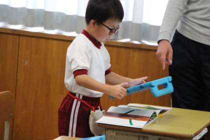 くすのき学級のICT学習と国語の授業の様子をお知らせします。ICT学習は、本の紹介で一場面を撮影している場面です。