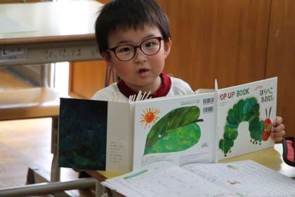 国語はプリント後の読書でしたが、お気に入りの「はらぺこあおむし」の飛び出す絵本バージョンを読みました。