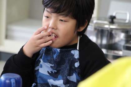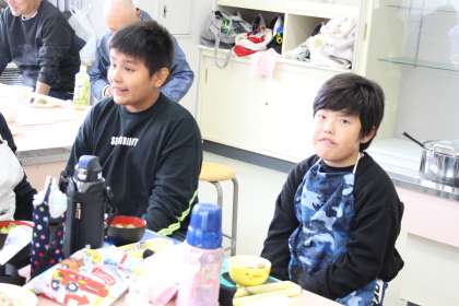 あすなろ学級の餅つき会後の会食の様子をお知らせします。自分たちでついたお餅と、保護者やボランティアの方が作ってくれた豚汁やおこわをいただいている様子です。