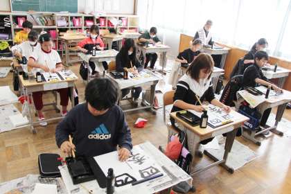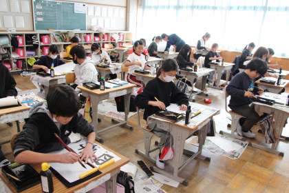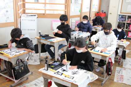書き初め大会5 公開日 2024/01/09 更新日 2024/01/09 お知らせ 5年生の書き初め大会の様子をお知らせします。書き初め大会を統計的にみると、1枚目が一番いい字が書ける傾向にあるので、スタートまでじっくり時間をかけ、心を落ち着けてから書き始めました。
