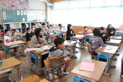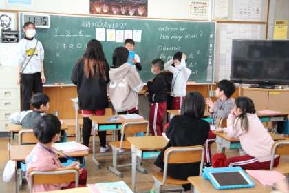 4年生の外国語活動「名前当てクイズ大会」の授業の様子をお知らせします。名前のアルファベットの数からスタートし、どの文字が入っているか、どこに入るのかを聞いていく中で、名前を当てるクイズでした。