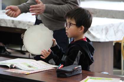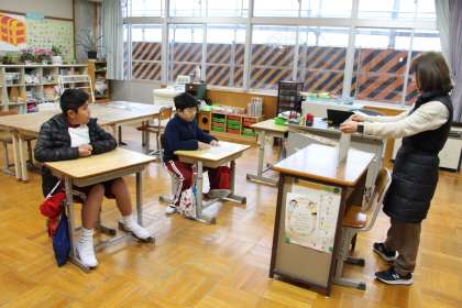 あすくす学級の授業 公開日 2024/01/22 更新日 2024/01/22 お知らせ あすくす学級の授業の様子をお知らせします。あすなろ学級は、朝の学習で「紙芝居」を見聞きしている様子です。絵本とは違ったよさがあります。国語の授業では、「緑色の学習」とテキストに取り組みました。 くすのき学級は、交流の音楽で「タンブリン演奏」をしている様子です。打つタイミングを計りながら、正しく演奏することができました。