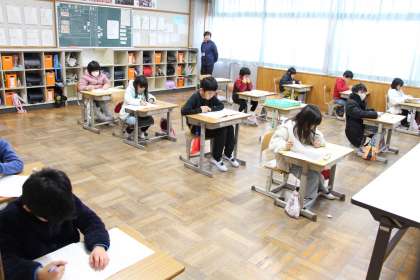 本校では昨日から学力テストを行っています。テスト中に教室にお邪魔するのは、文字通り「お邪魔」ですので、できるかぎり子どもたちに影響のないように「こそっと」記録写真を撮ってきました。