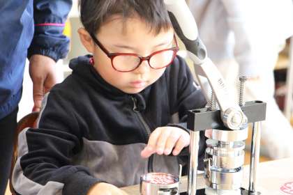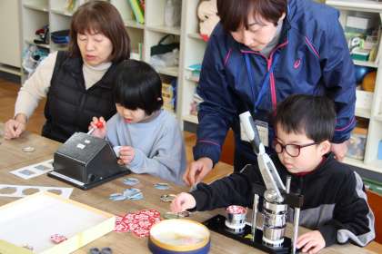 くすのき学級の体育と缶バッチづくりの様子をお知らせします。体育では、大谷選手からいただいたグローブを使って、キャッチボールを行いました。また、明日の入学説明会に向けて、缶バッチづくりを行いました。定番である「We Love 石畳」と「だたみん」もバッチに加え、新入生のために作ったものもあり、3種類のバッチをプレゼントする予定です。