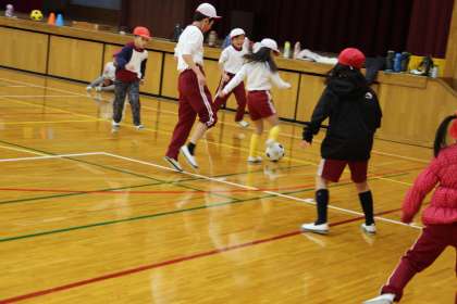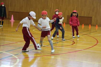 2年生の体育「ボールけり遊び」の授業の様子をお知らせします。本時は、3つのチームに分かれ、4人の攻め 対 2人の守りのゲームをしながら、パス回しの大切さとシュートの正確さを追求しました。