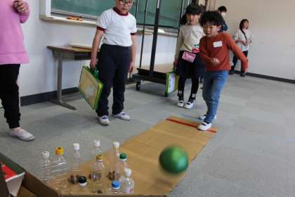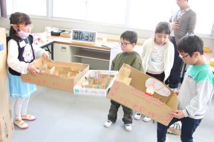入学説明会と並行して行った1年生との交流の様子をお知らせします。1年生は、自分たちで作った「手作りおもちゃ」で遊びました。遊んだ後は、手づくりの景品もプレゼントしました。今日のために、特別支援学級の児童が中心になって作成した「缶バッチ」もプレゼントしました。