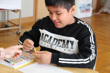 あすなろ学級の国語と図工、社会の授業の様子をお知らせします。国語は本の読み聞かせ、図工は色を塗る前に、色の学習をしている場面です。