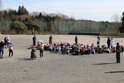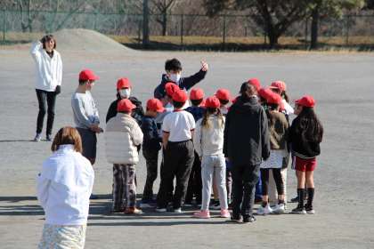 昨日の記事になりますが、代表委員会の企画で「全校鬼ごっこ」を行いました。赤い帽子の鬼が、白い帽子の児童を捕まえる鬼ごっこです。代表委員の説明の後、ゲームがスタートしました。鬼軍団も円陣を組み、作戦を伝授していました。