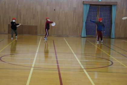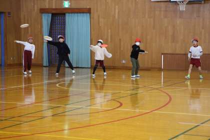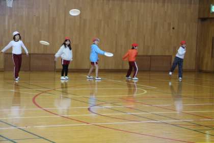 2年生の体育「フライングディスク投げ遊び」の様子をお知らせします。表現運動が終わった後、教科担任が行っている「アルティメット」で使うフライングディスクを投げる体験を行いました。普通のボール投げとは少し違った投げ方が必要ですが、みんな上手に投げていました。