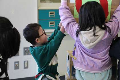 くすのき学級生活科 公開日 2024/02/27 更新日 2024/02/27 お知らせ くすのき学級の生活科「卒業を祝う会練習」の様子をお知らせします。1年生の出し物である「段ボール積み木メッセージ」を楽しみました。グループの子と協力して、メッセージができた時の表情がいいですね!