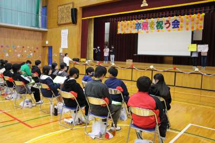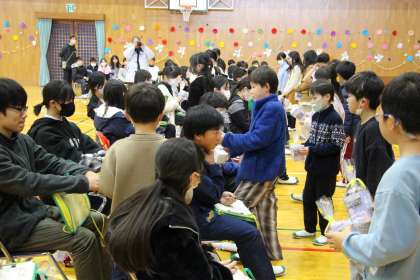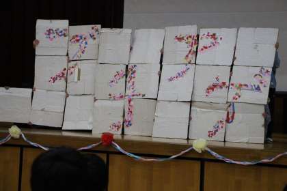 卒業を祝う会3 公開日 2024/02/29 更新日 2024/02/29 お知らせ 3年生との「卒業を祝う会」の様子をお知らせします。3年生は、6年生に関するクイズ大会でした。思い出を振り返りながら楽しく活動できました。また、段ボール製の「巨大ネームプレート」を使ったパネルワークも披露しました。パネルワークの締めは、裏面に描いた級訓「ブチアゲ」でした。