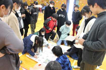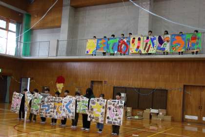 4年生との「卒業を祝う会」の様子をお知らせします。4年生は工夫を凝らした「謎解き」です。校内の各教室を回って得たカードを集めた後、最後の謎解きに挑戦しました。謎解きの指令(うしろをみろ)に従って体育館後方に視線を向けると、4年生からのメッセージが披露されました。