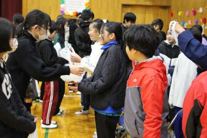 「卒業を祝う会」のお礼として6年生から各学年の児童にプレゼントを贈りました。本校の伝統になりつつある缶バッチのデザインは、「校章」をモチーフにしたものです。6年生のお手製のものですので、大切にしてほしいと思います。