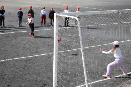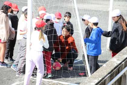 本時の内容はPKです。サッカーのゴールの定義(上部から見て、ボール全体がゴールラインを完全に超えたら得点になる)の説明後、赤白に分かれてPK戦を行いました。サッカーの大きな大会で「三苫の1mm」とか、つい先日の女子サッカーでも「山下の1mm」など、ゴールなのかどうかの判定があったので、タイムリーな学習となりました。