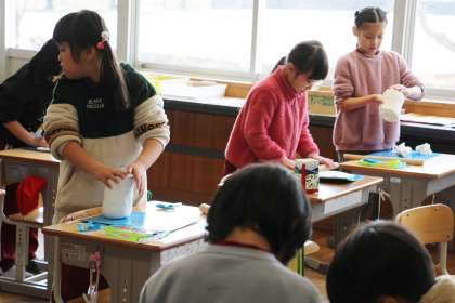 1年生の図工「ペン立てづくり」の様子をお知らせします。ペットボトルや牛乳パックに紙ねんどを巻いていき、ペン立てを作りました。