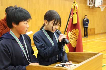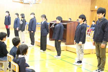 卒業生から在校生への引継式を行いました。まず、6年生からのメッセージを伝えた後、5年生に校旗の引継ぎを行いました。