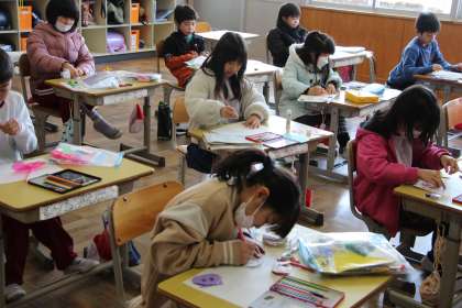 2年生の生活科「メッセージ表紙づくり」の様子をお知らせします。メッセージの表紙を色を塗ったり、飾りをつけたりしました。とてもきれいに仕上がっており、メッセージを受け取った人が喜ぶ表紙ができました。