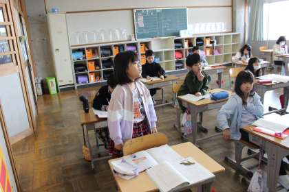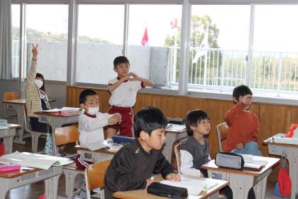 3年生は、国語の授業で「すいせんのラッパ」のお話を読み、登場人物について確認しました。お話の中に出てくる「グローブみたいなカエル」はどんなカエルなのか、大きさなどを想像したり話し合ったりする様子が見られました。