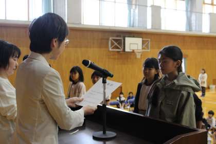前期学級委員と委員長を任命しました。 学級、委員会のリーダーとして、仲間と協力しながら頑張ってほしいと思います。