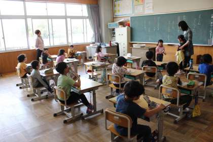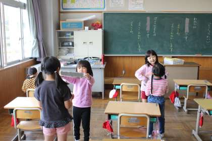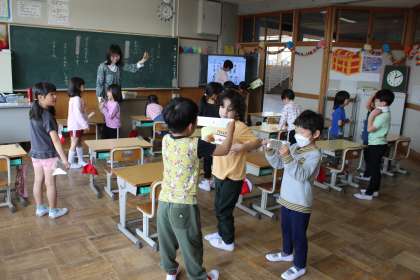 1年生の自己紹介の様子です。名前のカードを見せながら、「わたしは〜です。よろしくおねがいします」と言い、楽しそうに自己紹介をしていました。