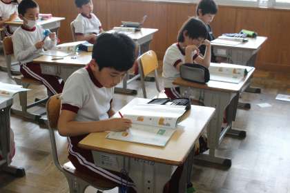 3年生の算数の学習の様子です。 割り算の問題に頭を悩ませながら、一生懸命問題を解く姿が見られました。