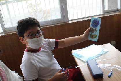 理科の「春みつけ」で見つけた花を使ってしおりを作りました。様々な花びらを使い、配置を考えながら、楽しそうに作っていました。