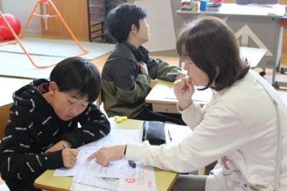 あすくすの算数の学習の様子です。 先生に教えてもらいながら、1つ1つ問題を解いていく様子が見られました。