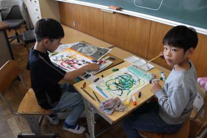 3年生の図工「絵のぐ+水+ふで=いいかんじ!」の授業の様子です。