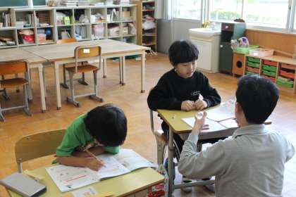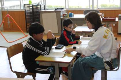 あすくすの学習の様子です。 国語では、先生に教えてもらいながら、一生懸命音読する姿が見られました。