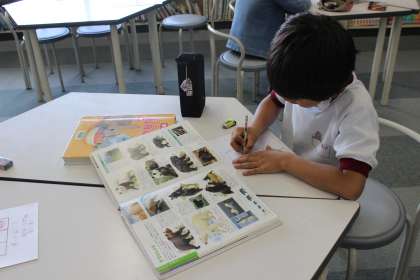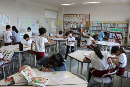 4年生が図書室で読書はがきを書いていました。